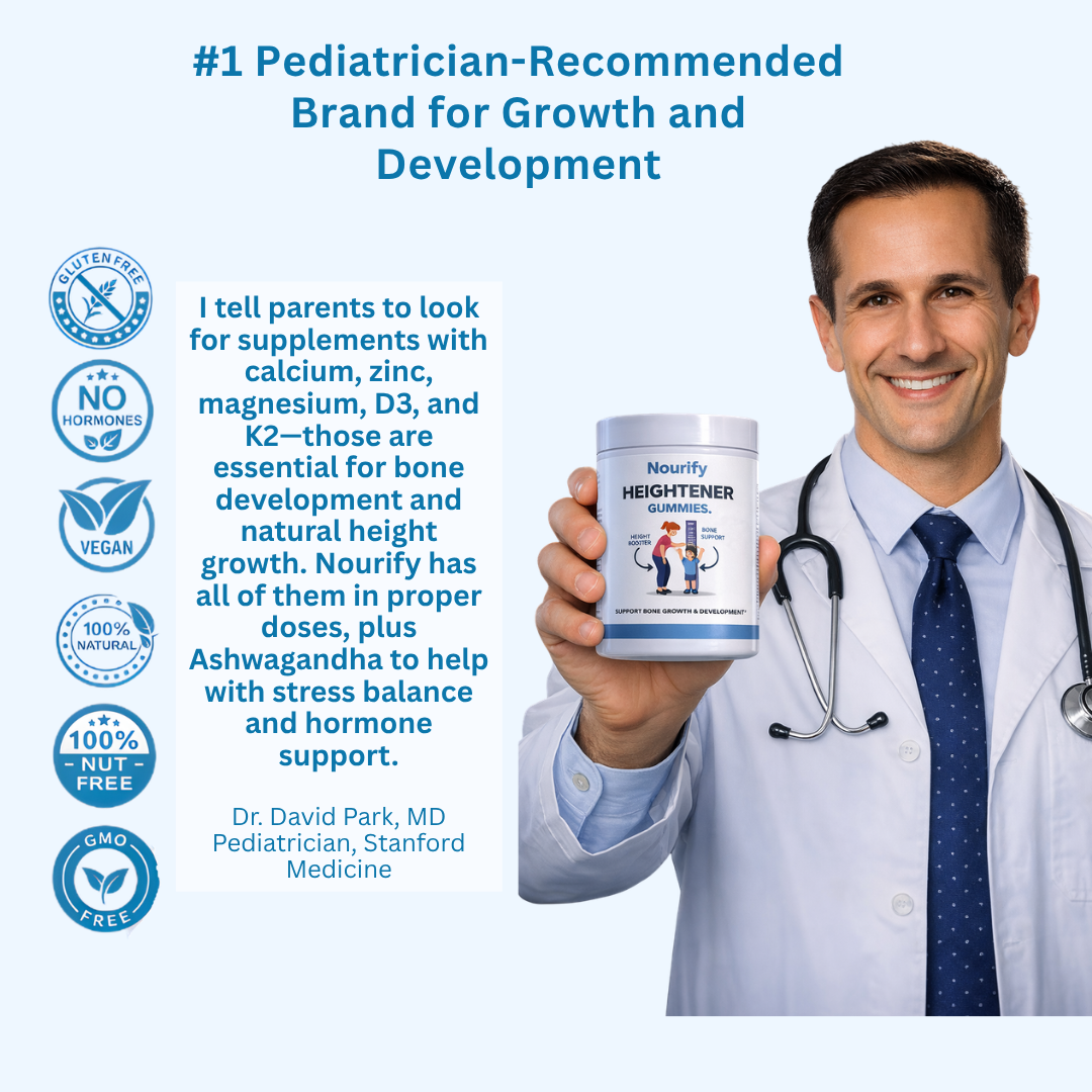 Nutritional deficiencies may impact children's ability to reach their full growth potential. That’s why we designed Nourify Heightener Gummies, with the help of expert pediatricians, to provide kids and teens with the essential nutritional support their bodies need for healthy growth and development—when combined with a balanced diet.